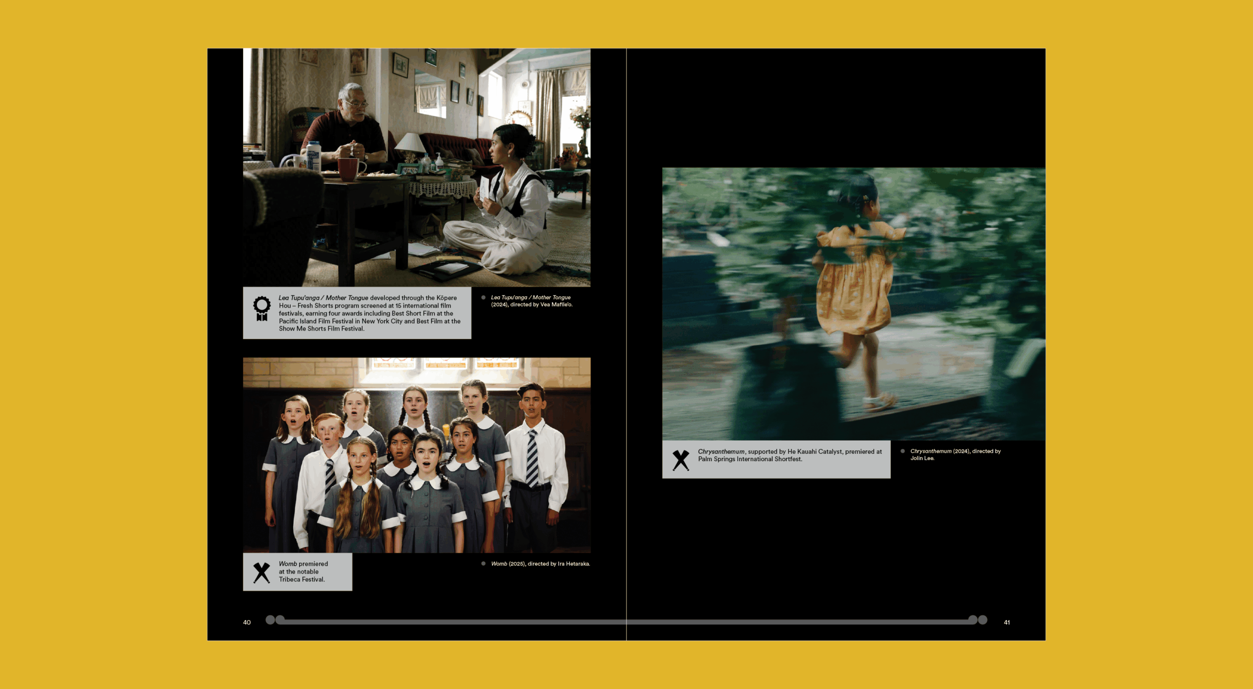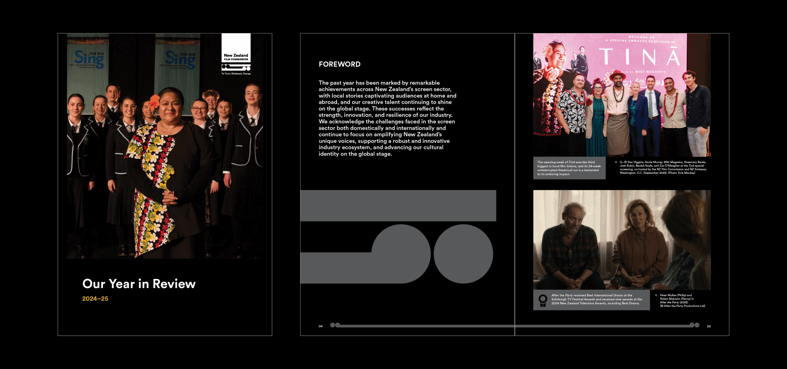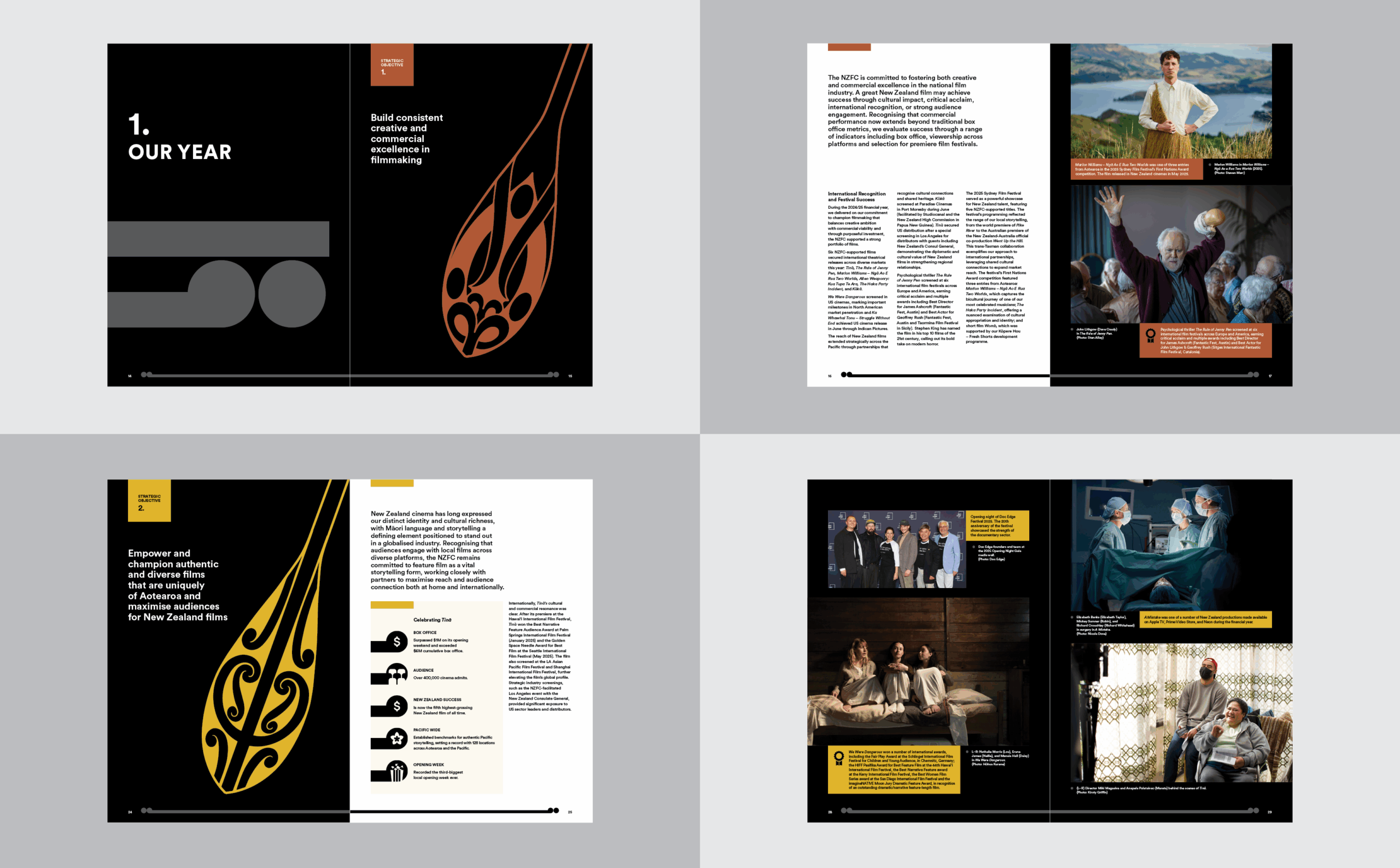 Building on the Commission’s established visual language, we looked for opportunities to elevate key messages and celebrate success. We structured content to highlight outcomes and impact, and connect the Commission’s work back to its core purpose: investing in New Zealand stories and talent.